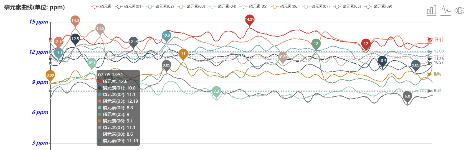 7、用戶可以隨時(shí)通過手機(jī)和計(jì)算機(jī)遠(yuǎn)程查看、下載數(shù)據(jù)。軟件可以查看最高值、最低值、平均值。用戶可根據(jù)土壤水分和電導(dǎo)率、氮磷鉀養(yǎng)分的數(shù)據(jù)變化來分析土壤各個參數(shù)之間的關(guān)聯(lián)性和相互影響。