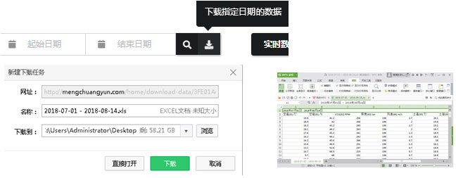 3、查詢功能:可通過查詢?nèi)掌诘姆绞娇焖俨檎?、下載所需的數(shù)據(jù),并以EXCEL表格的形式導(dǎo)出數(shù)據(jù)。具體操作:第一、輸入要查詢的日期時間段,點擊查詢按鈕即可;第二、點擊查詢右側(cè)三角按鈕,出現(xiàn)下載數(shù)據(jù)并點擊即可(圖2);第三、在圖2中選擇下載的位置并點擊下載按鈕即可(圖3)。詳見如下: