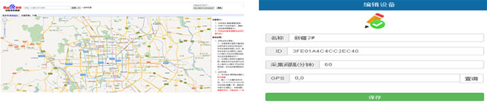 4、設(shè)置功能:顯示編輯設(shè)備界面,可設(shè)置數(shù)據(jù)采集間隔和設(shè)置地理位置坐標,點擊保存按鈕即可成功。GPS定位具體操作:點擊查詢按鈕,在圖中百度要添加的地理位置,并拾取其坐標復(fù)制粘貼到該處即可。如下: