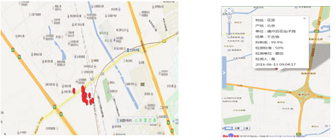 9、GIS地圖生成:利用檢測設(shè)備內(nèi)置的GPS模塊,實現(xiàn)衛(wèi)星定位數(shù)據(jù)捆綁測試數(shù)據(jù)信息,實施GIS地圖定點監(jiān)控每個檢測點的位置信息,監(jiān)測者可在其衛(wèi)星定位圖標上點擊位置坐標查看該檢測點測試數(shù)據(jù)相關(guān)索引信息。