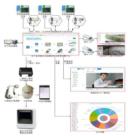 本平臺(tái)由若干個(gè)子平臺(tái)組成,分布于農(nóng)產(chǎn)品生產(chǎn)基地、農(nóng)產(chǎn)品批發(fā)市場(chǎng)、農(nóng)產(chǎn)品加工企業(yè)、超市、各單位食堂,每個(gè)子平臺(tái)有農(nóng)藥殘留速測(cè)儀、PC電腦、系統(tǒng)PC端軟件組成。都有獨(dú)立的用戶名和密碼。子平臺(tái)的所有數(shù)據(jù)都可對(duì)接立刻同步上傳給XX?。ㄊ?、縣)《農(nóng)產(chǎn)品安全追溯系統(tǒng)平臺(tái)》。