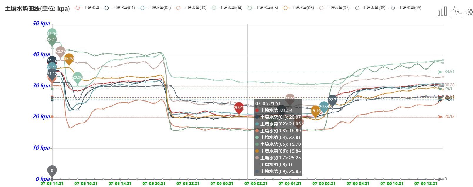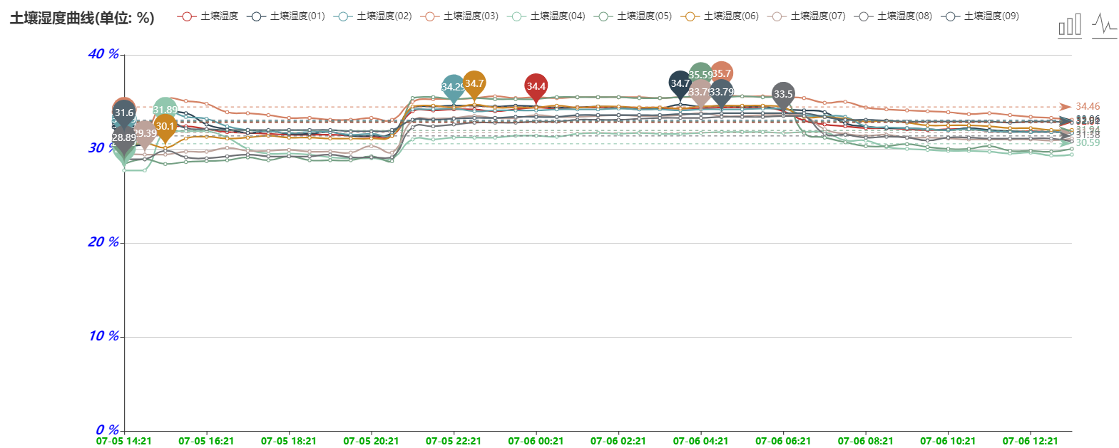 5、用戶可以隨時通過手機和計算機遠(yuǎn)程查看、下載數(shù)據(jù)。軟件可以查看數(shù)據(jù)編號、曲線走勢圖、最高值、最低值、平均值。用戶可根據(jù)土壤水分和電導(dǎo)率、水勢、氮磷鉀養(yǎng)分的數(shù)據(jù)變化來分析土壤各個參數(shù)之間的關(guān)聯(lián)性和相互影響。