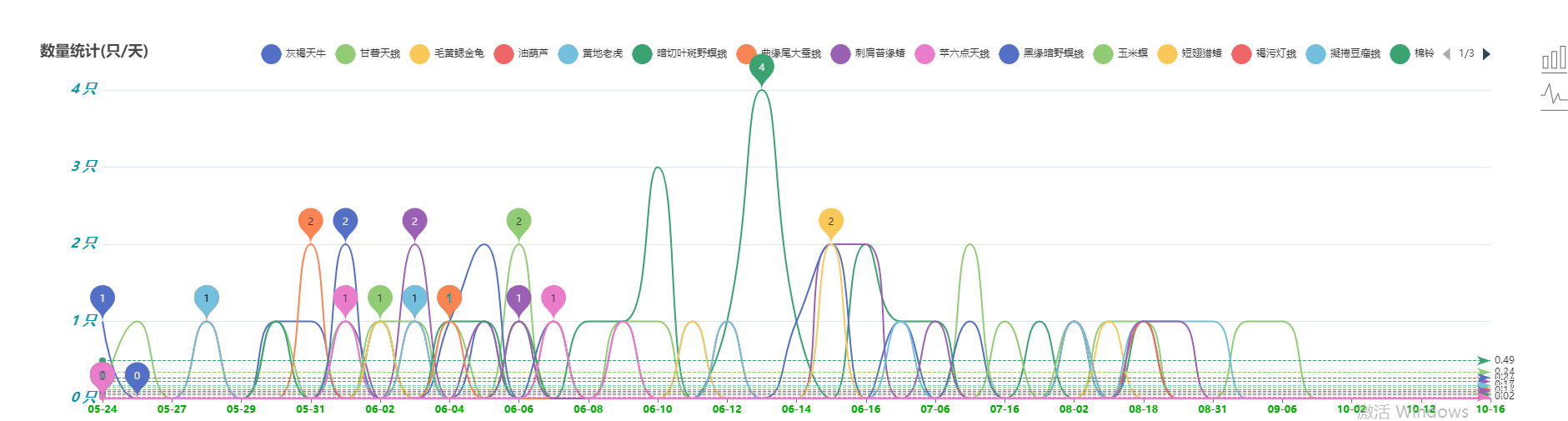 5、蟲害統(tǒng)計功能。針對不同品種害蟲識別結(jié)果歷史數(shù)據(jù),可選擇一定時間范圍內(nèi)數(shù)據(jù)查詢統(tǒng)計,通過圖表形式顯示。可選任意害蟲種類,直觀看出發(fā)生的蟲害種類和數(shù)量,從而判斷其危害程度。