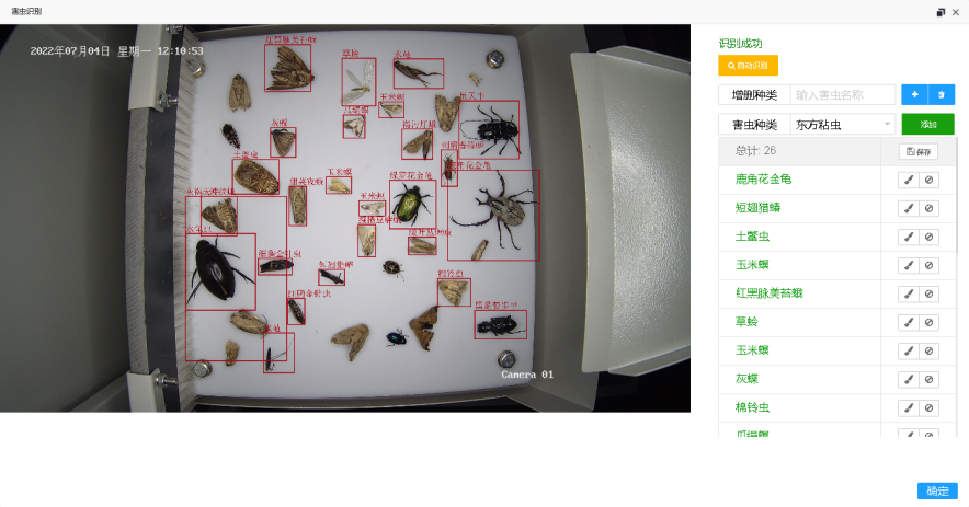 (1)自動識別。使用本公司《人工AI智能蟲體識別系統(tǒng)》V3.0自動識別蟲體照片中的害蟲種類同時計數(shù)。