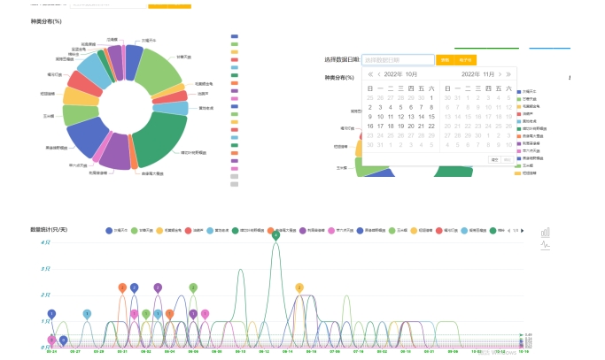5、蟲害統(tǒng)計功能。針對不同品種害蟲識別結(jié)果歷史數(shù)據(jù),可選擇一定時間范圍內(nèi)數(shù)據(jù)查詢統(tǒng)計,通過圖表形式顯示??蛇x任意害蟲種類,直觀看出發(fā)生的蟲害種類和數(shù)量,從而判斷其危害程度。